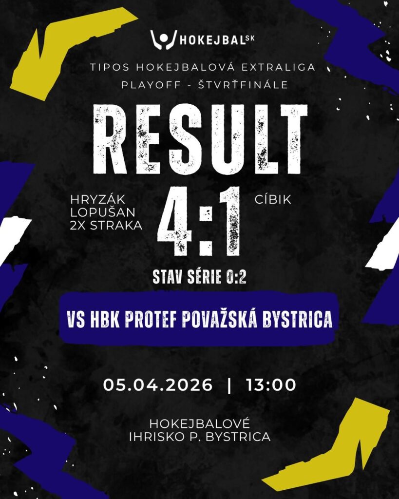 Druhý zápas štvrťfinálovej série proti Považskej Bystrici sme v TIPOS Hokejbalovej extralige odohrali v nedeľu 5. apríla 2026 na súperovom ihrisku.