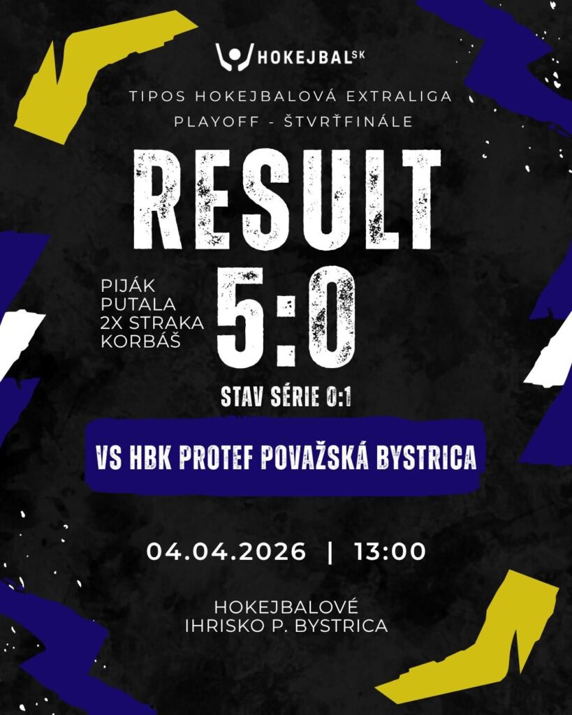 V TIPOS Hokejbalovej extralige sa v sobotu 4. apríla 2026 začala vyraďovacia časť. Našim súperom je vo štvrťfinálovej sérii Považská Bystrica a začínali sme na jej ihrisku.
